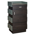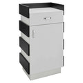 The simple shape of the furniture is broken up by decorative chipboard slats. Despite its very compact size, the reception desk offers functional solutions – a practical drawer and a lockable cabinet, which facilitate daily work organization.