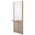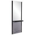 A tall rectangular mirror visually opens up the space, and a silver footstool provides comfort for clients. It also features a shelf where clients can place their coffee or phone, and it provides the hairdresser with a convenient place to store their current tools.